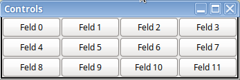 Der GridSizer legt seine Elemente in enem Gitter ab, deren Felder immer gleich sind. Im Parameter erhält er die Anzahl der Spalten. Beim Auffüllen mitAdd(Element, 1, wxEXPAND, 0, 0);werden die Elemente von links nach rechts, dann von oben nach unten aufgefüllt.