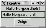 Das Widget Entry dient zur Eingabe einer Zeichenkette. Das folgende Beispiel erzeugt ein Fenster mit einem Eingabefeld, einem Label und einem Button. Wenn Sie etwas in das Eingabefeld eintippen und dann den Button anklicken, wird der Inhalt im Label angezeigt.