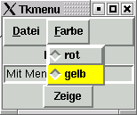 Zu jedem etwas größeren Programm gehört auch ein Menübaum. Dieser besteht aus mehreren Elementen, die im Programm nacheinander generiert werden. Zunächst wird die Menüleiste (engl. menubar) erzeugt. Sie befindet sich immer am Kopf eines Fensters. Diese Position nennt sich unter Tk toplevel. In der Menüleiste werden kaskadierende Buttons eingesetzt, die beim Anklicken das eigentliche Menü aufklappen. Dahinter endlich verbergen sich die eigentlichen Menüpunkte, die bei Tk Command heißen und wie gewöhnliche Buttons funktionieren. Auch ihnen wird bei Erzeugung eine Callbackfunktion zugeordnet. Allerdings ist das nicht zwingend. Im Beispiel ist als zweite Kaskade eine Farbenselektion eingebaut, hinter der sich Radiobuttons verbergen. Wegen des Unterhaltungswertes sind die Menüpunkte auch gleich in der Farbe dargestellt, die man mit ihnen anwählen kann.