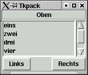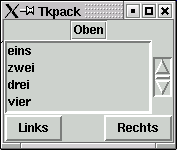 Durch die Option -side kann die Richtung angegeben werden, von der aus das Fenster aufgefüllt wird. Die üblichen Argumente der Option sind 'top' und 'left'. Dann werden die Widgets nacheinander von oben nach unten respektive von links nach rechts aufgefüllt. Natürlich gibt es auch die Argumente 'bottom' und 'right'. Der Vorgabewert ist übrigens 'top'. Das Vorgehen kann man sich vorstellen, als würde man mit der Kreissäge ein Stück des Fensters abschneiden. Ein Aufruf von pack() mit der Option -side 'top' würde also für das Widget die obere Kante des Fensters abtrennen. Der untere Rest kann nun noch frei verteilt werden. Diesen Rest können Sie wiederum an einer der Kanten absägen. Ein Problem ergibt sich, wenn Sie ein Fenster aus Label, Listbox, Scrollbar und zwei Buttons erstellen wollen, wie Sie es in der Abbildung sehen.