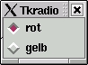Der Radiobutton ist eine andere Variante der Buttons. Man könnte ihn als eine Weiterentwicklung des Checkbuttons ansprechen. Mehrere Buttons werden zusammengefasst. Es darf nur einer angewählt sein. Er hat seinen Namen von den Stationstasten eines Radios, von denen ja auch immer nur eine gleichzeitig angewählt sein kann. Wird eine andere gedrückt, springt die bisher gedrückte Taste heraus.