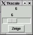 Das Widget Scale ist ein Schieber, mit dem Sie Zahlenwerte einstellen können. Mit dem Kommando get lässt sich der Zahlenwert auslesen. Das folgende Beispiel erzeugt einen solchen Schieber und übernimmt den Wert in ein Label, wenn der Button gedrückt wird.