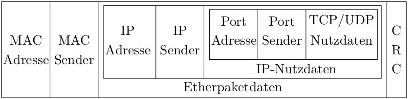 Das äußere Paket ist das Ethernetpaket, das durch die Hardware transportiert wird und liegt damit in der untersten Schicht. Darin befindet sich das IP-Paket der Netzwerkschicht und darin wiederum das Paket der Transportschicht. In den TCP/UDP Nutzdaten wird dann das Paket der Anwenderschicht transportiert, beispielsweise eine Anfrage oder Antwort im Web mit dem Protokoll HTTP.