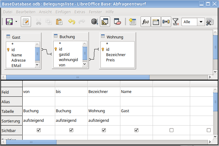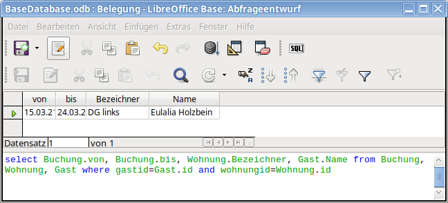 Sie können eine Abfrage auch klassisch als SQL-SELECT-Anweisung formulieren. Beispielsweise könnte die folgende Abfrage eine Belegungsliste erzeugen:SELECT Buchung.von, Buchung.bis, Wohnung.Bezeichner, Gast.Name FROM Buchung, Wohnung, Gast WHERE gastid = Gast.id AND wohnungid = Wohnung.id
