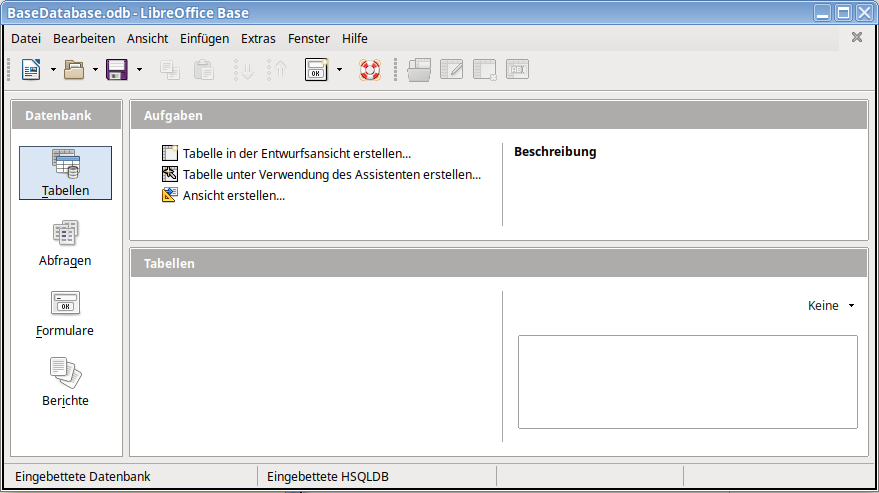 Base ist in der Lage, mit allen möglichen Datenbanken zusammenzuarbeiten, verwendet aber auch eine interne Datenbank namens HSQLDB und benötigt dann nicht die Installation einer weiteren Datenbank.