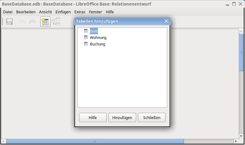 Die Beziehungen zwischen den Tabellen werden durch Fremdschlüssel realisiert. Beispielsweise kann ein Gast mehrere Buchungen haben, aber für jede Buchung liegt nur ein Gast vor. Dies nennt man eine 1:n-Beziehung. Ähnliches gilt für die Beziehung zwischen Wohnung und Buchung.- Im Bereich Datenbank muss Tabellen angewählt sein.