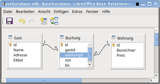 - Von Wohnung das Element id nach Buchung wohnungid mit der Maus ziehen.