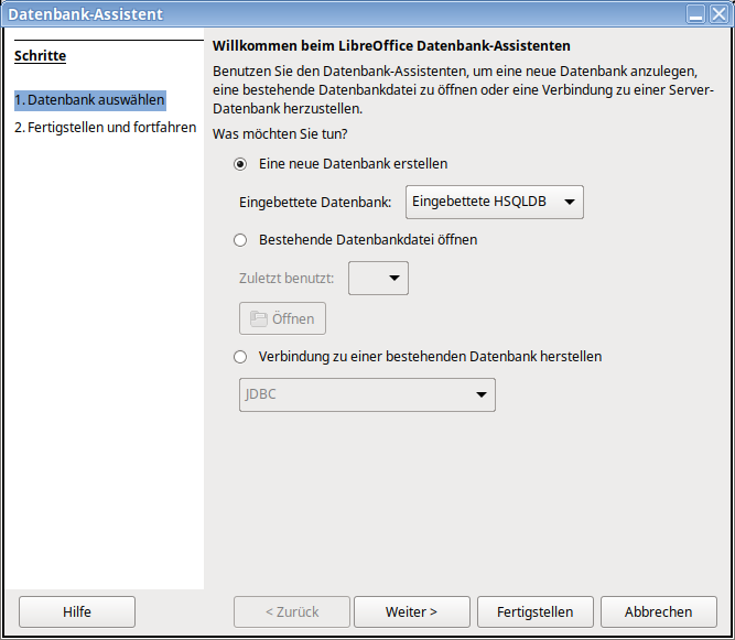 - Sie wählen Eine neue Datenbank erstellen. Auf den meisten Systemen ist die eingebettete HSQLDB die einzige Möglichkeit.
