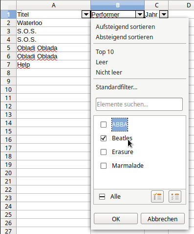 3. Sie können bei Interpret Beatles anhaken und es verschwinden nach Drücken von OK alle Einträge, die nicht von den Beatles stammen.
