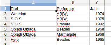 Natürlich muss man Daten erst einmal sortieren. Das gehört sich so. Dazu bietet Calc zwei einfache Varianten an. Dazu markieren Sie zunächst den Bereich von A2 bis C7. Sollen die Daten nicht einfach nach der ersten Spalte sortiert werden, sondern beispielsweise nach der Jahreszahl. Bei gleicher Jahreszahl (1968) sollen die Titel nach der Reihenfolge ihrer Interpreten sortiert werden. Wir benötigen dazu mehrere Sortierungsschlüssel. Hier die Vorgehensweise: