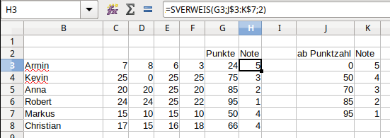 Anstatt die Noten von Hand einzutragen, kann man die Tabellenkalkulation fragen. Die Funktion SVERWEIS verwendet den ersten Parameter und schaut in einer Tabelle nach, die im zweiten Parameter definiert ist. Die erste Spalte ist der Schlüssel, die zweite Spalte der Tabelle der Wert, der an dieser Stelle übernommen wird. Hier ist es die Spalte 2. Darum ist der letzte Parameter auch 2.