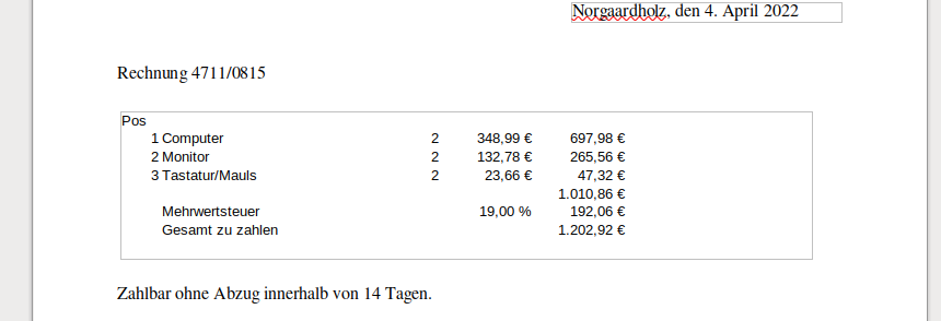 Für eine Rechnung verwendet man normalerweise einen Formbrief. Darin befindet sich üblicherweise eine Tabelle, die die Berechnung der Kosten enthält.