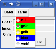Das Farbmenü ist noch ein klein wenig anders aufgebaut. Hier wurde ein Radiobutton ins Menü gehängt. Als kleiner Gag werden die einzelnen Farben auch im Menü farbig hinterlegt. Die Radiobuttons korrespondieren mit einer Variable, die speziell behandelt wird. Hier ist es eine Fließkommavariable, die aus dem Tk mit dem Aufruf DoubleVar() erzeugt wird. Diese wird jedem Radiobutton als Parameter variable mitgegeben. Jeder Radiobutton hat als value-Parameter die Voltzahl, die an der jeweiligen LED abfällt. Dieser Wert wird bei Anwahl des Radiobuttons direkt in die Variable geschrieben.