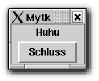 Beim Erzeugen werden für Label und Button gleich ein paar Ressourcen gesetzt. Das erfolgt in Form einer Zuweisung, die sich innerhalb der Parameterklammern befindet. Mit text="Huhu" wird die text-Ressource des Labels mit dem String »Huhu« belegt.In der Abbildung sehen Sie das Miniprogramm, wie es auf dem Bildschirm erscheint.