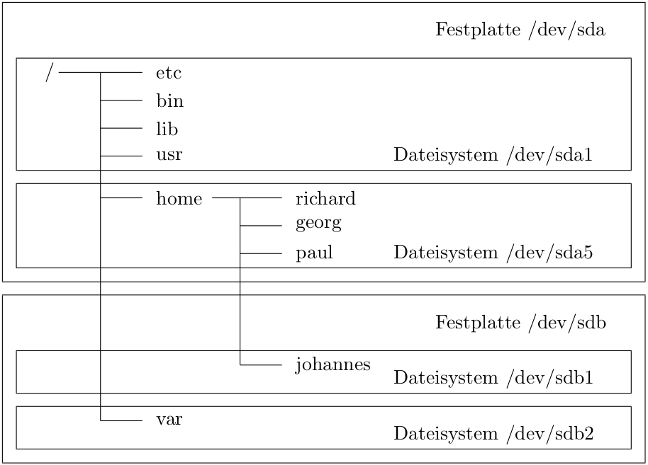 Die Dateisysteme werden in den Standardverzeichnisbaum eingehängt. Die Abbildung zeigt das Einhängen mehrerer Dateisysteme in einen Verzeichnisbaum.