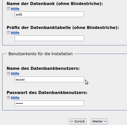 grant all privileges on mediawiki.* to 'wikiuser'@'localhost';Dieser Benutzer sollte dann gern noch ein Passwort bekommen, dass wir als strenggeheim vereinbaren.
