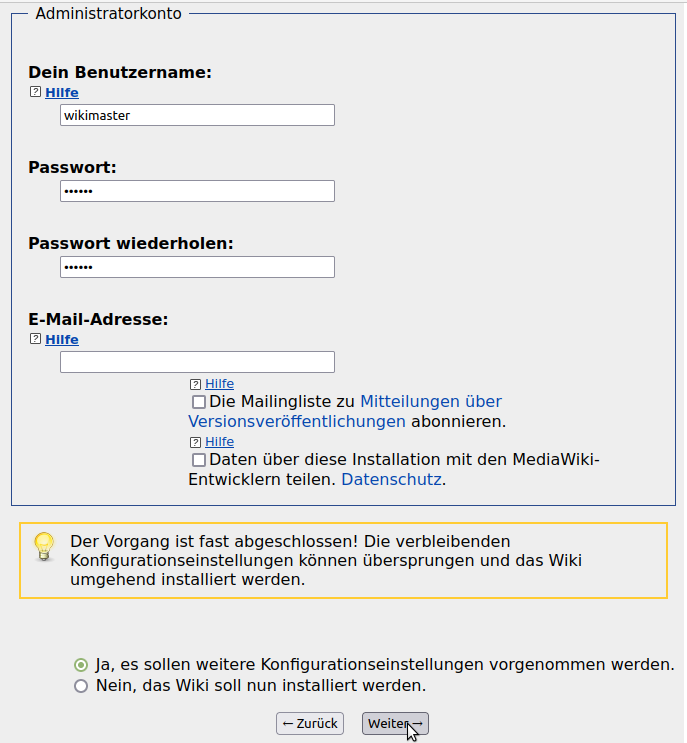 - Einrichtung des Administratorkontos für den Wiki-Betrieb