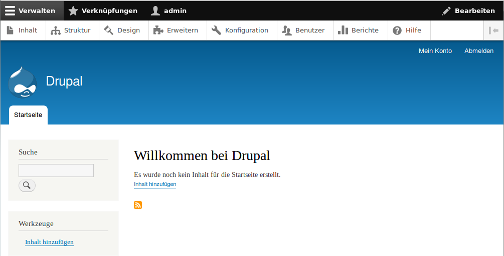 Die Installation kann man prüfen, indem man auf dem lokalen PC die Adresse localhost/Drupal aufruft. Von einem anderen PC aus, kann man localhost durch den Namen oder die IP-Adresse des Hosts ersetzen.Nach der Anmeldung als admin mit dem bei der Installation vergebenen Passwort ergibt sich folgendes Bild, wenn der Menüpunkt Verwalten aktiv ist: